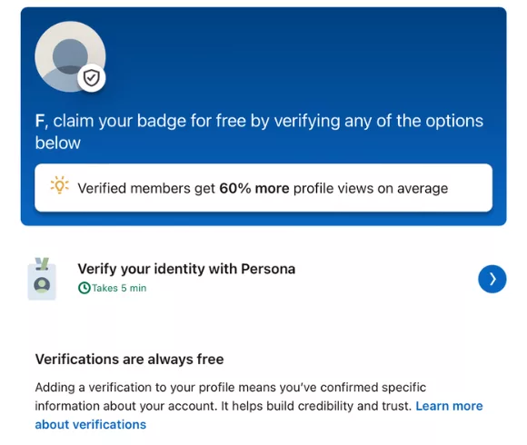 Verified LinkedIn accounts get 60% more profile view on average. Verifications are always Free